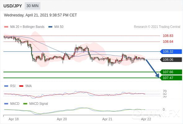 如突破 108.32 ,USD/JPY 目标方向为 108.64 和 108.83 。