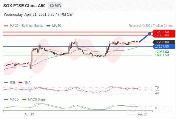 如跌破 17157.50 ,新交所富时中国A50指数期货 目标方向定在 17057.50 和 16997.50 。