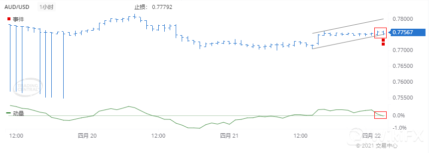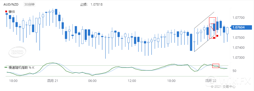 · 当%K线向下穿越%D线时,2021 4月 22日(GMT时间01:00)针对慢速随机指标的利空事件触发。交易的收盘价接近于最近最高-最低价格范围的较低端,这与价格下跌有关。