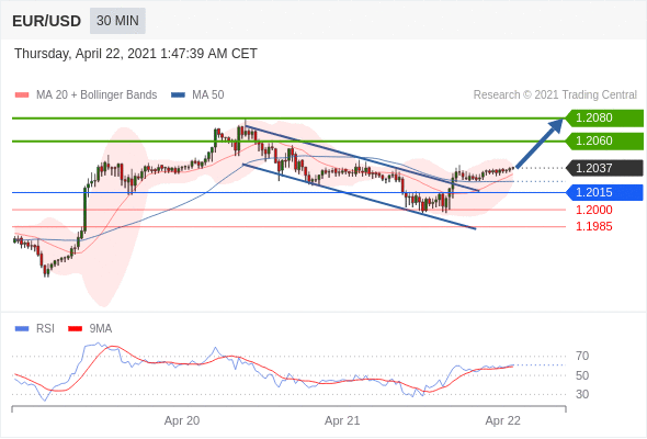 在 1.2015 之上,看涨,目标价位为 1.2060 ,然后为 1.2080 。