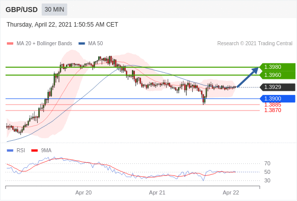 在 1.3900 之上,看涨,目标价位为 1.3960 ,然后为 1.3980 。