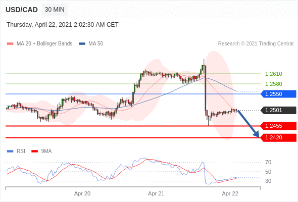 在 1.2550 之下,看跌,目标价位为 1.2455 ,然后为 1.2420 。