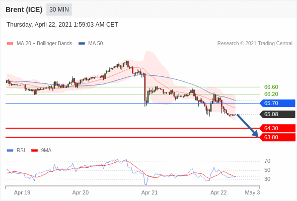 在 65.70 之下,看跌,目标价位为 64.30 ,然后为 63.80 。