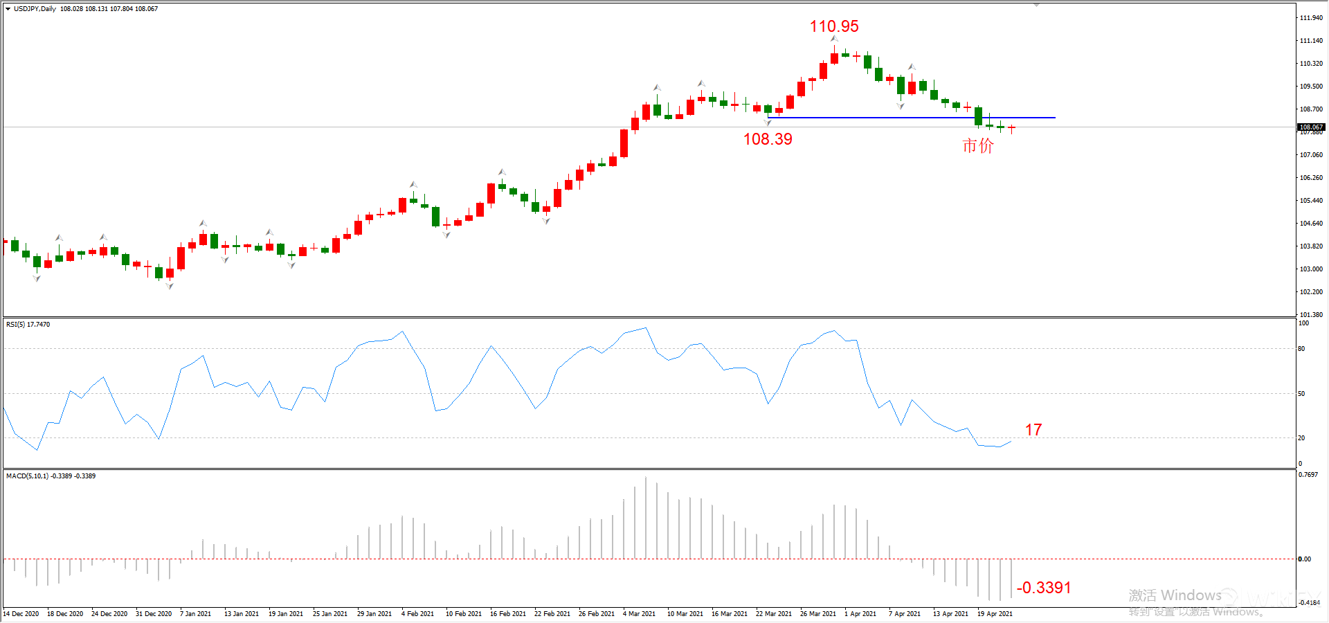 综合判断:在108.39附近形成支撑概率较高,随后开启上涨。