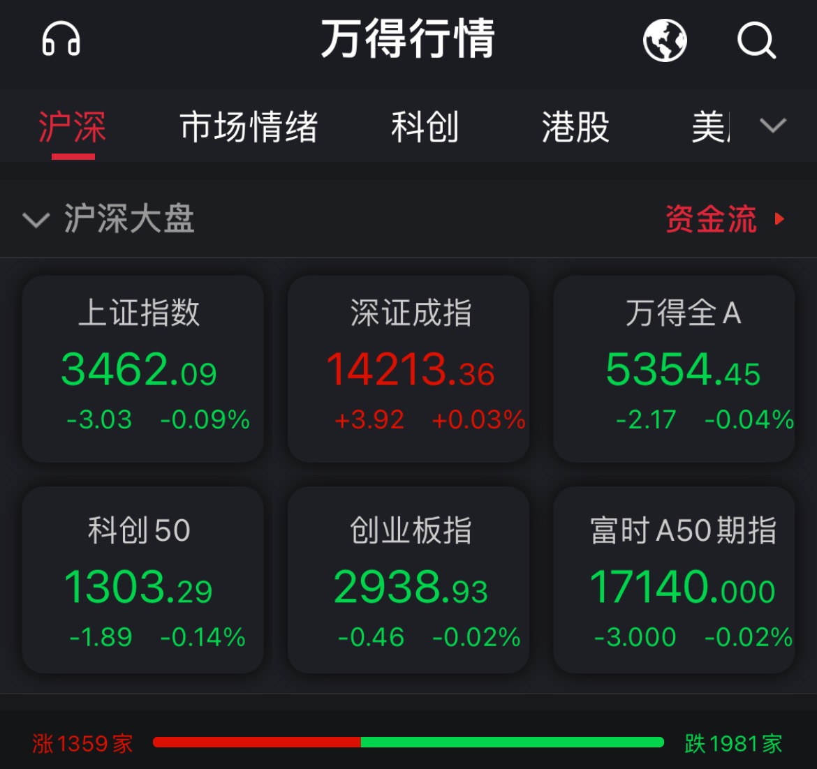 沪指低开3462.09点,跌幅0.09%,成交额27.21亿元;深成指报14213.36点,涨幅0.03%,成交额43.79亿元;创业板指报2938.93点,跌幅0.02%;上证50指数3487.12点,跌幅0.01%;沪深300报5088.83点,跌幅0.01%。