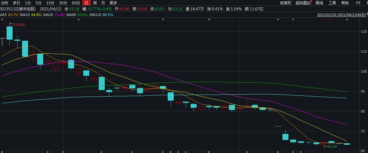 据Wind数据显示,年内,顺丰控股盘中最高点股价为2月18日的124.06元,截至4月22日收盘,顺丰控股报63.18元/股,股价距离高点跌幅近半,市值蒸发超2700亿元。