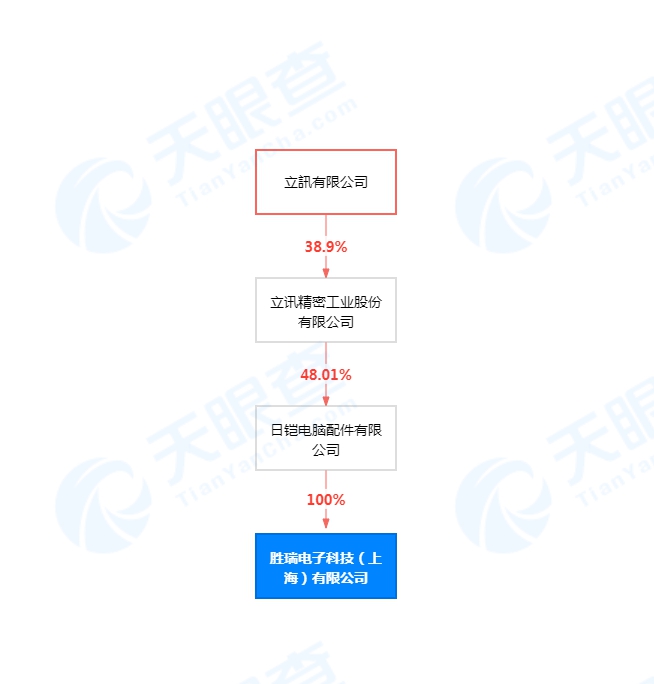 天眼查APP显示,胜瑞电子科技(上海)有限公司为日铠电脑配件有限公司100%控股公司,日铠电脑配件有限公司受到立讯精密(002475,股吧)工业有限公司控股,而立讯精密工业有限公司又受到立讯有限公司38.9%控股。因此,胜瑞电子疑似实控人为立讯有限公司。