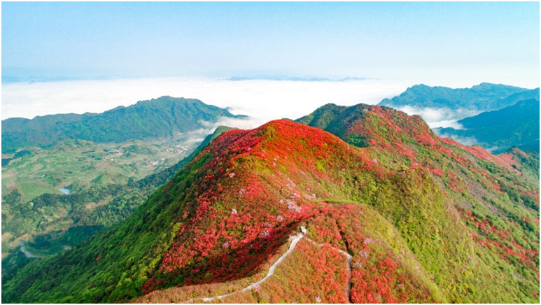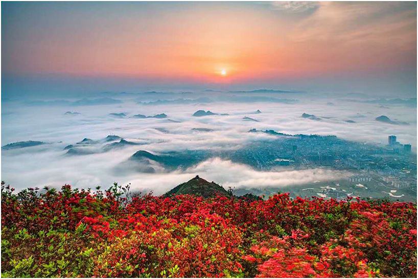 海拔近1500米、有着“万亩杜鹃”之称的丹寨龙泉山,毗邻贵州省黔东南州丹寨县城,从山腰至山顶长满了野生的红杜鹃,这里的花海曾获央视《新闻联播》点赞并在抖音播放超1.4亿次,成为全国各大杜鹃花海中的网红,每年都吸引上百万的游客前来观赏。“四面清风皆入画,一片闲云独看花”,置身花的海洋,人们晨起可登顶观云海杜鹃日出磅礴,傍晚可俯瞰赏日落彩霞漫山红遍。4月23日到5月4日,正值丹寨龙泉杜鹃盛花期,一年一度的中国丹寨杜鹃花节将在龙泉山脚下的丹寨万达小镇隆重举行,30多项亮点纷呈的展演、比赛和深度体验活动,为“史上最热五一黄金周”热情打Call。