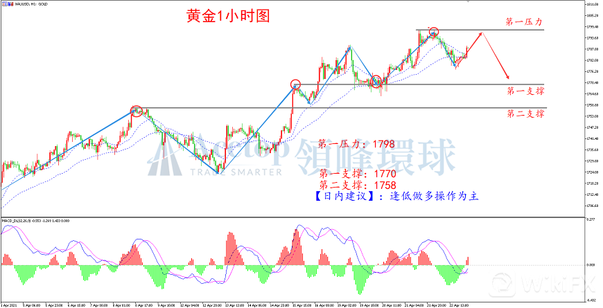昨日黄金试图冲击1800点整数关口,但在1798点附近受阻回落,下跌幅度一度达到20美金之多。这也就意味着市场在此一带压力较大。短期市场MACD指标由绿翻红,意味着短期会有反弹。反弹恰好是上方布局空单的好机会。尽管市场依然处于震荡上行的趋势当中,但每次反弹的力度都在逐渐减弱。因此,1798一带将有较强的压力,建议投资者尝试在1798附近布局空单。