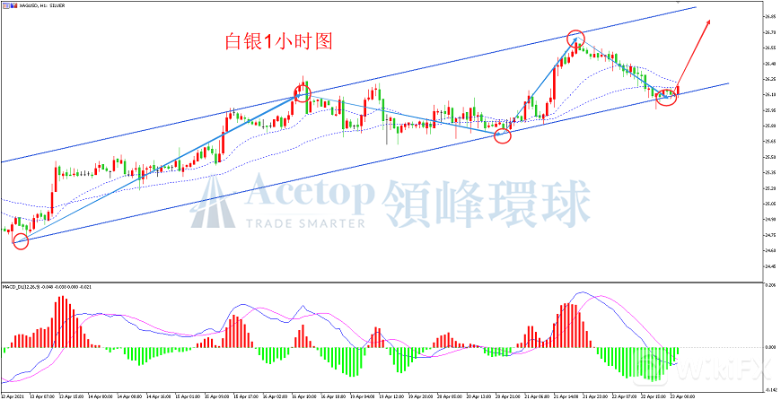 从1H周期图看,沿着上行通道震荡上行。目前为止,上行通道保持良好,白银没有出现跌破趋势线的迹象。且下方MACD指标经过本次调整,绿色动能柱逐渐缩短,红色动能柱或将出现。意味着后期有概率形成反弹。因此建议投资者继续保持做多。目前通道下轨支撑在26.0附近,建议投资者尝试在此位置附近布局多单。