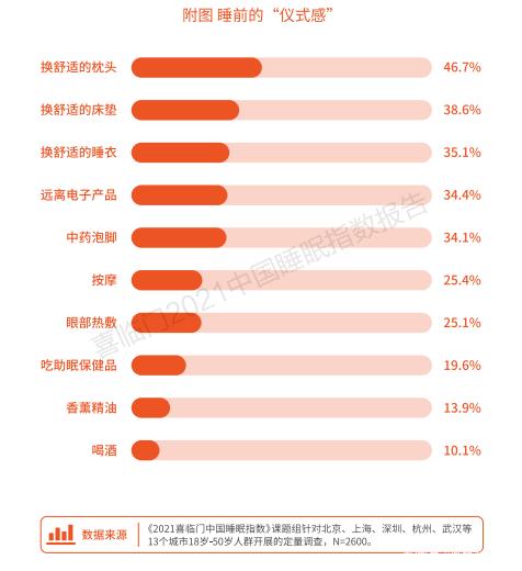 《报告》显示,为了提高睡眠质量,多数人会通过很多极具“仪式感”的方式帮助自己快速入眠。其中,46.7%的人会选择更换舒适的枕头,38.6%的人会更换舒适的床垫,还有35.1%的人换上舒适的睡衣,由此可见寝具对于睡眠的重要性。