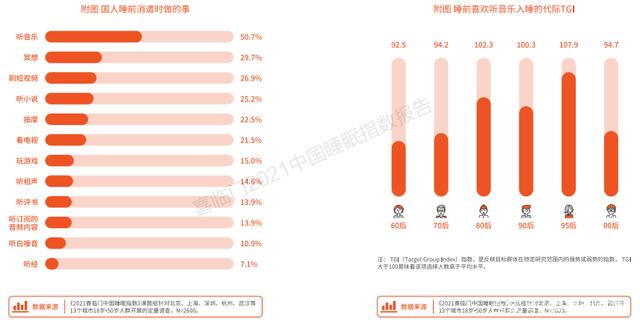 此外,《报告》数据显示,在众多睡前消遣方式中,50.7%的人喜欢听音乐的方式为自己助眠;其次是用冥想来排除杂念,提升入睡速度,占29.7%;也有26.9%和25.2%的人选择在睡前刷短视频和听小说。而在喜欢听音乐的人群中,95后、80后、90后占多数。
