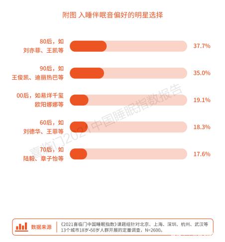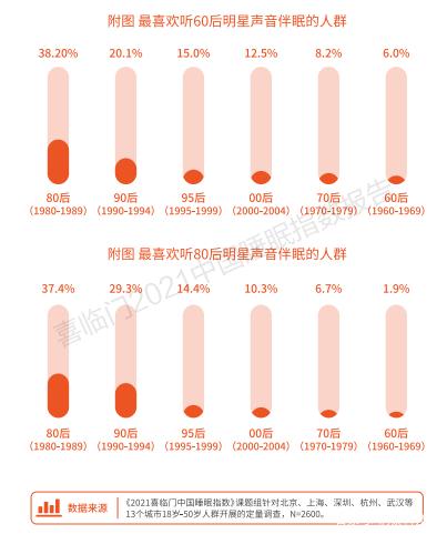 不过,各年龄段的明星声音偏好也不尽相同。80后最为怀旧。他们既喜欢听着60后明星声音入睡,也喜欢听自己代际的明星声音入眠。