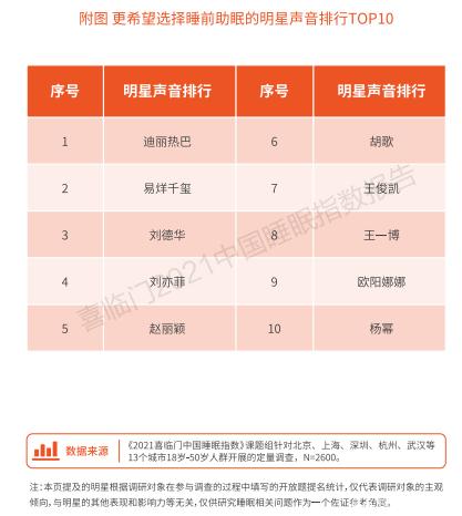 除了听音乐,很多人还会选择听一些明星的歌曲来入眠。本次调研特地询问了大家最希望听到的伴眠明星,调查显示,国人选择最多的明星声音排行榜前三名为迪丽热巴、易烊千玺和刘德华。