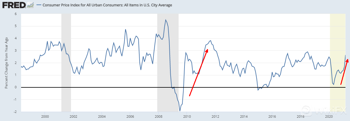 (上图为美国CPI年增数据,与2009年雷同,预计将受基数关系而大幅攀升)