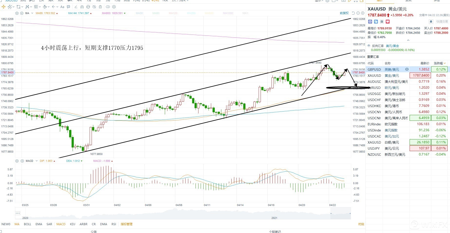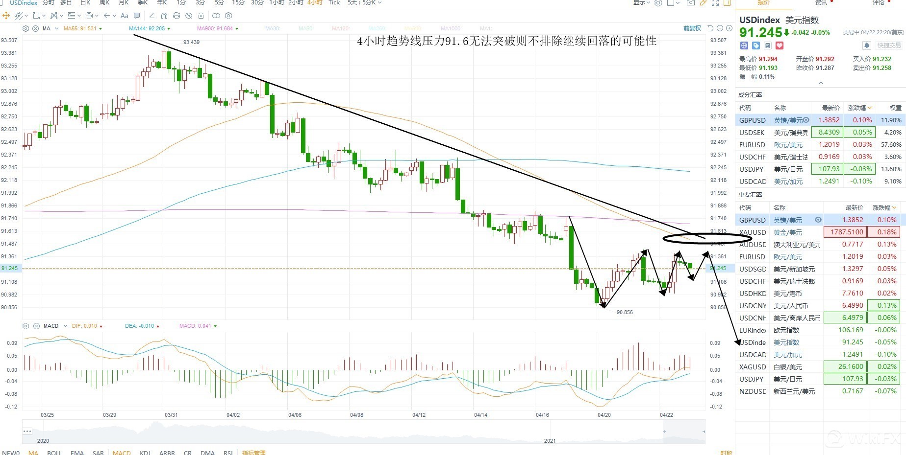 周四美股创近五周最大跌幅,因美国总统拜登将提议把针对富人的资本利得税提高近一倍,对于长期投资而言,抬高成本,股市受到打压,而美元小幅反弹,美债收益率继续低位盘整,目前基本面偏向于利空美元,股市层面更多的是震荡,随着消息面的摆动而摆动,短期而言继续关注基本面的变化,近期美债收益率连续下行,关注是否有出现反弹的可能性,黄金在1800关口遇阻回落,短期上行动力不足,以箱体震荡为主,等待方向选择,或者基本面消息的催化。日内主要美元指数4小时下降趋势线压力91.6附近无法突破则有可能继续下跌