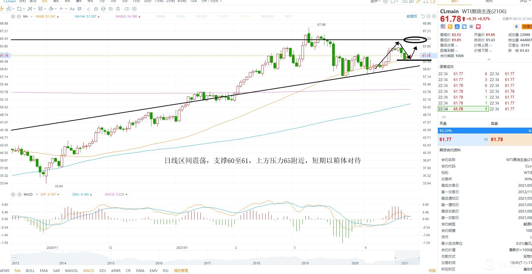 美原油小幅震荡,目前基本面多空均衡,股市下跌支撑油价走强,而日本,印度新增疫情上升打压需求端扩张预期,同时全球气候峰会上削减温室气体排放标准打压油价,总体而言还是处于区间之内,没有明显的方向选择,技术层面上日线支撑60至61区间不破则再次反弹箱体上沿65美元压力,短期没有消息面支撑的前提下以震荡对待,高抛低吸,等待方向选择