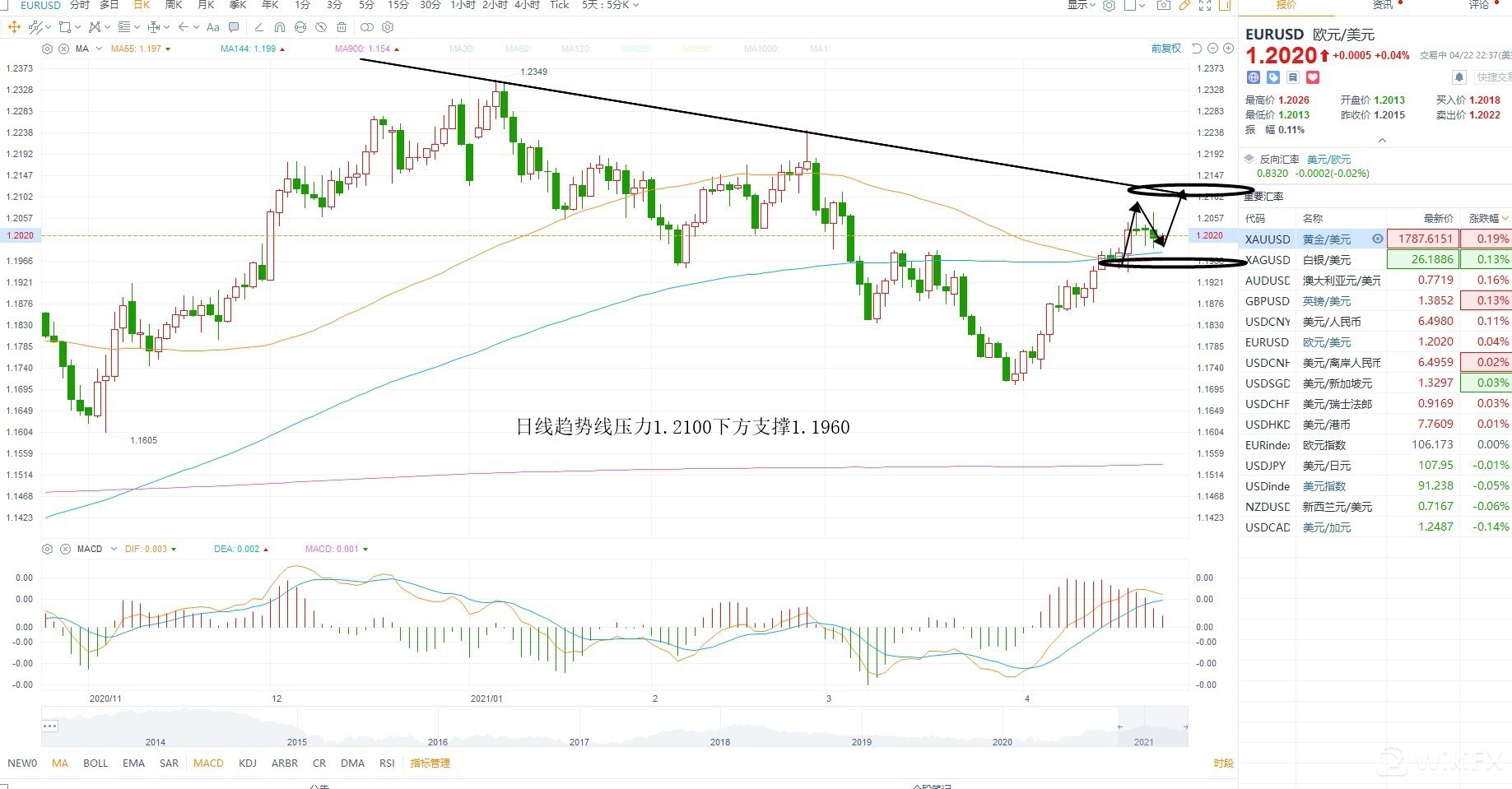 昨日欧央行利率决议,欧美波动不大,而美元指数出现了小幅反弹,基本面上需要关注今日欧元区PMI以及美国Markit制造业PMI,目前美元指数反抽4小时趋势线没有突破之前反转的概率不大,因此欧美继续维持震荡上行的观点,不过在日线趋势线压制之下,没有形成突破之前追涨需谨慎,日内多空分水岭1.2100突破则打开向上空间,不破则回踩前期水平支撑1.1960附近