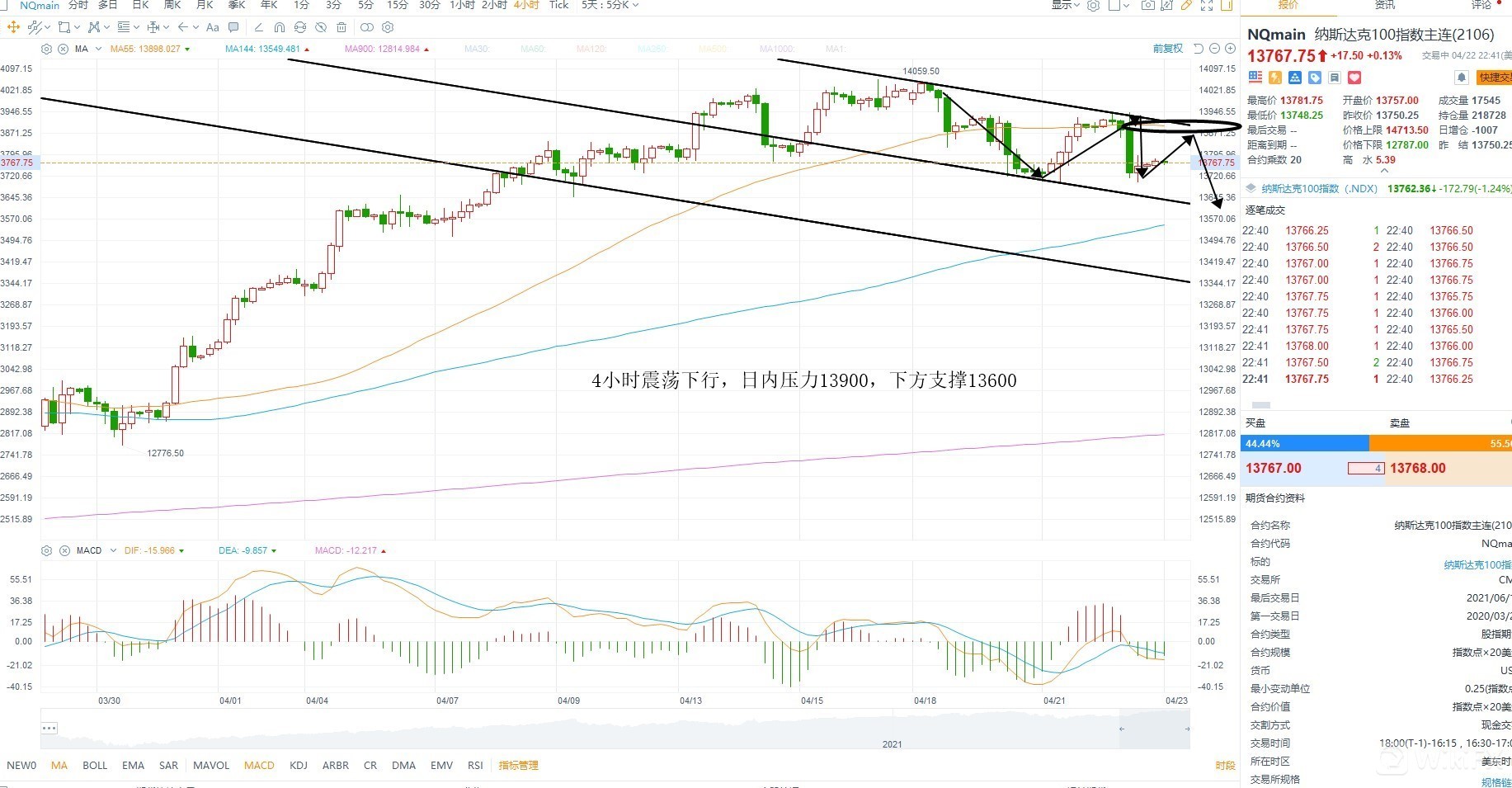 昨日提高资本利得税打压股市,三大指数起跌,这个完全是消息面的催动,从技术层面来看,纳斯达克指数在高位调整而已,4小时下行趋势线尚未突破,大概率会延续震荡,日内需要注意上方压力13900不破则谨慎做多,下方支撑13600短期以箱体对待,如果持续高位盘整但无法突破新高则谨防出现盘整头部,日内偏向震荡下行为主
