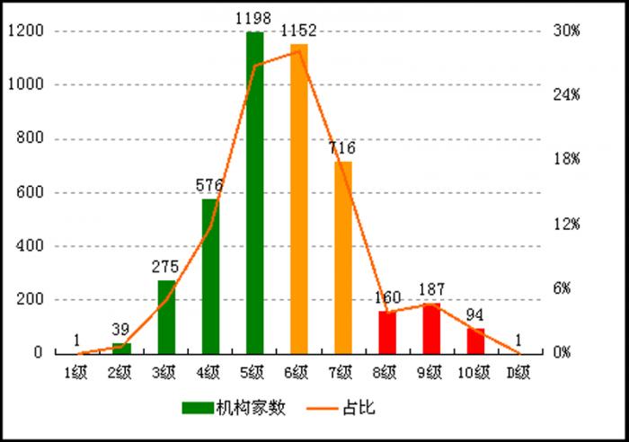 从机构类型看,大型银行评级结果最好,农合机构风险较高,具体为: