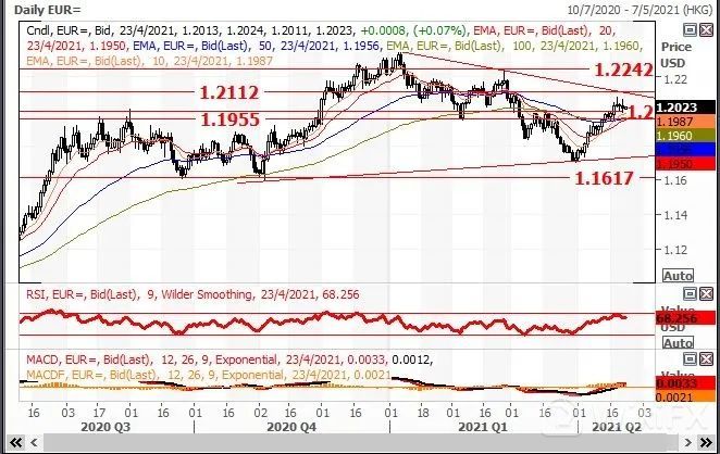 欧洲央行昨议息,维持政策不变,PEPP买债计划前景留待6月会议考虑。与对岸加拿大大不同,欧洲央行行长拉加德态度审慎,并谓提早结束买债仍是言之尚早。欧洲央行未有向市场释出减少买债的信号或时间表令欧元多头失望。欧元兑美元在会议前早段曾升至1.2069,声明公布后价格曾急跌,一度失守1.2000心理关口。现时,日线图出现三角形态等候突破,不过由于3角形是初步形成,预期价格将测试1.2112后会回测1.20心理关口。但如最终突破1.2112,向上第1站将上试2月25日高位1.2242。