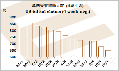 美国上周首次申领失业援助人数意外减少3.9万至54.7万,预测升至61.7万,连续两周低于60万水平,4周平均连续两周改善。4月非农业职位数据的调查范围,4周平均较3月减少96,250。这些数字都指向4月就业职位强劲增长。