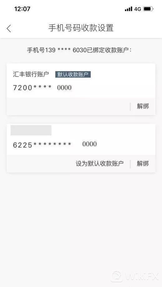 登录汇丰中国手机银行,进入【人民币转账】->【转账及收款设置】->【手机号码收款设置】可查看所有绑定账户信息(含他行),并设置默认账户或编辑他行绑定账户