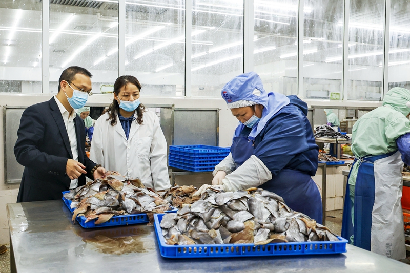 浙江农信定海海洋农商银行深入推进融资畅通工程,深化流水贷、首惠贷、续贷通等特色产品应用,分类施策、精准帮扶,切实降低企业融资门槛和融资成本。今年以来,该行已为辖内135户企业放贷9.8亿元。图为该行客户经理在龙欣水产公司进行贷后检查。 本报记者 刘志良 通讯员 曾力 摄