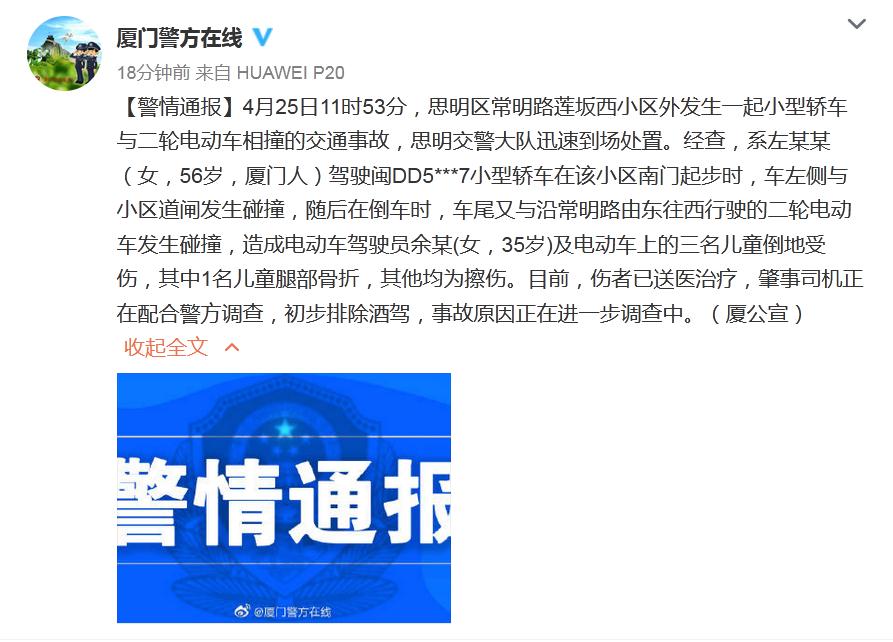 据福建省厦门市公安局官方微博最新通报,4月25日11时53分,思明区常明路莲坂西小区外发生一起小型轿车与二轮电动车相撞的交通事故,思明交警大队迅速到场处置。经查,系左某某(女,56岁,厦门人)驾驶闽DD5***7小型轿车在该小区南门起步时,车左侧与小区道闸发生碰撞,随后在倒车时,车尾又与沿常明路由东往西行驶的二轮电动车发生碰撞,造成电动车驾驶员余某(女,35岁)及电动车上的三名儿童倒地受伤,其中1名儿童腿部骨折,其他均为擦伤。