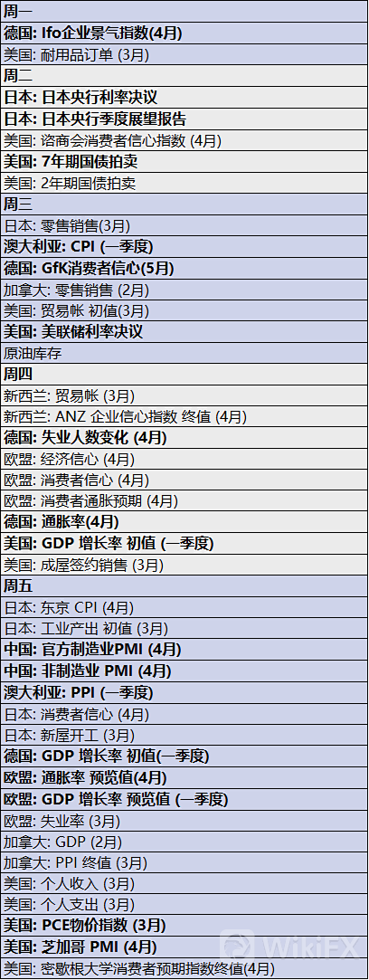 本周除了央行会议,还有美国的7年期国债拍卖、德国的就业人数变化以及多个国家的一季度GDP增长率。本周其它需要关注的重要经济数据如下:Forex