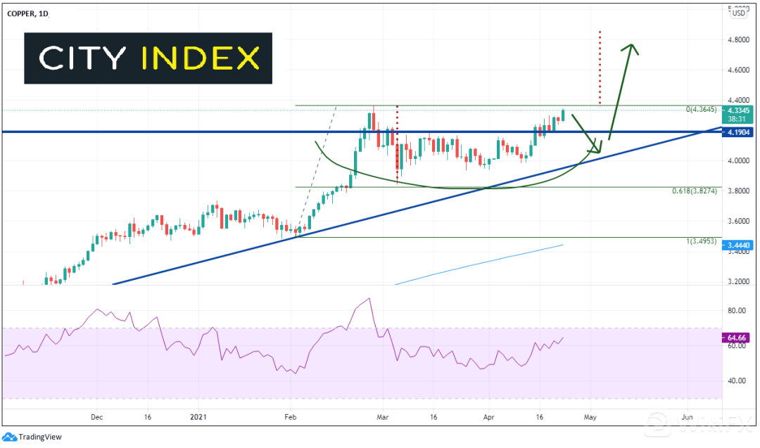 因为是一种工业金属,铜的价格据说透露全球经济的健康程度。当铜价强劲时,暗示经济强劲,将飞跃式成长。而若铜从下跌,透露出经济脆弱,世界经济可能萎缩。铜因此一直都有“铜医生”的昵称。自从2020年3月构筑疫情低点以来,铜价一直处于强劲的上涨趋势中,于2月23日攻克历史高点4.19附近,只是两天后回撤,至2月2日低点到2月23日高点的61.8%回档位,即3.83上方不远处,在上涨趋势中形成了一个圆底形态。铜价正在测试2月23日高点4.3645,目前交投于4.336。如果受制于该位,下看的第一支撑位在2011年以来高点4.1904附近。如果失守,下看2020年10月2日以来上升趋势线3.97附近。如果守住这些价位之一继而走高,可能形成杯柄形态。杯柄形态的目标在突破位加上“杯子”的高点,此例中在4.85附近。