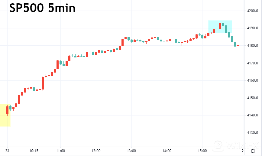 标普指数五分钟图;黄框为跳空高开;蓝框为创历史新高位置