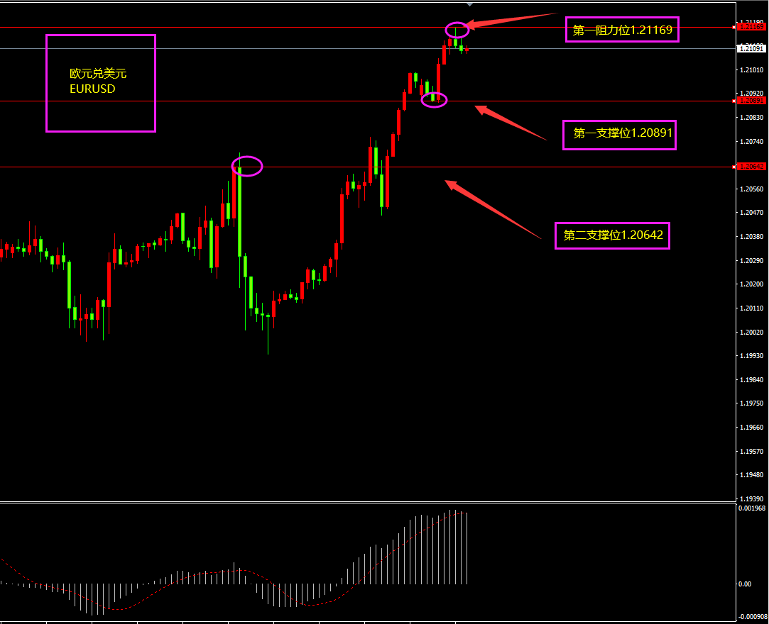 技术点评:天图欧元收大阳线,价格连续冲高,多头相对强劲,但短期连续冲高之后面临技术性回调,MACD并未大幅走强,多头进入调整,日内更多以试探性看空为主?小时图欧元期间连续阳线拉升,MACD位于0轴之上,多头占优,但目前能量已到峰值,面临回落,日内试探性看空?大阴线不出,空单不入。