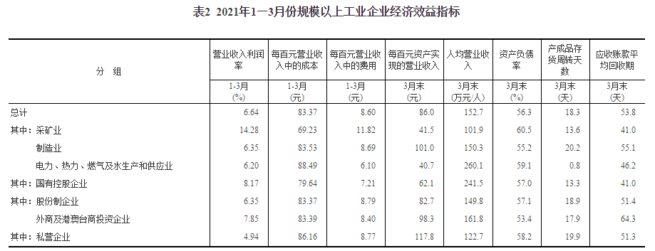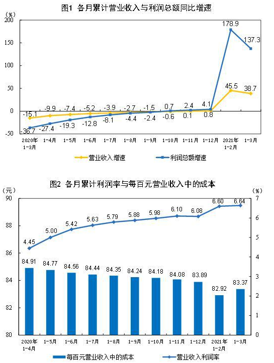 1—3月份,规模以上工业企业实现营业收入27.48万亿元,同比增长38.7%;发生营业成本22.91万亿元,增长36.5%;营业收入利润率为6.64%,同比提高2.76个百分点。