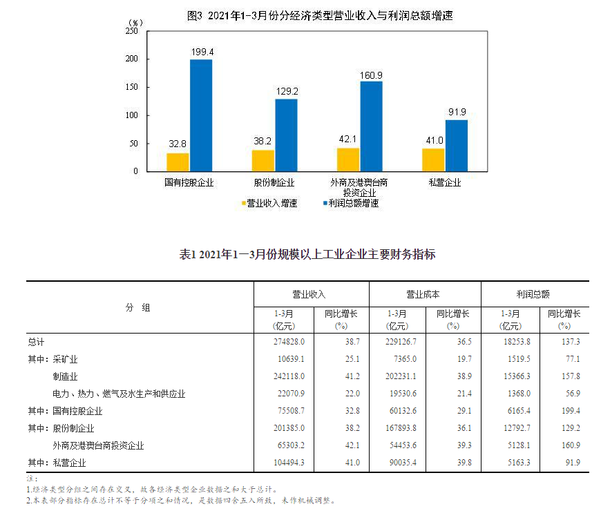 1—3月份,规模以上工业企业中,国有控股企业实现利润总额6165.4亿元,同比增长1.99倍;股份制企业实现利润总额12792.7亿元,增长1.29倍;外商及港澳台商投资企业实现利润总额5128.1亿元,增长1.61倍;私营企业实现利润总额5163.3亿元,增长91.9%。