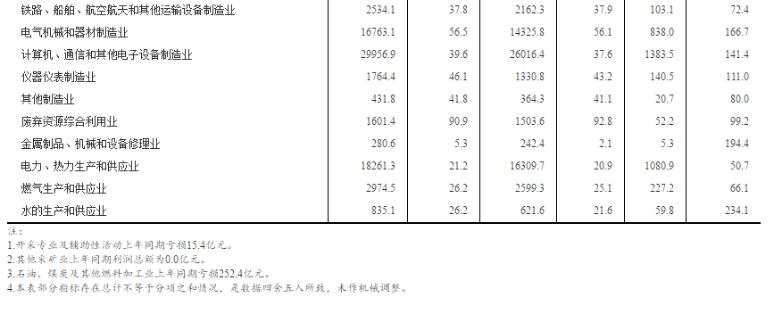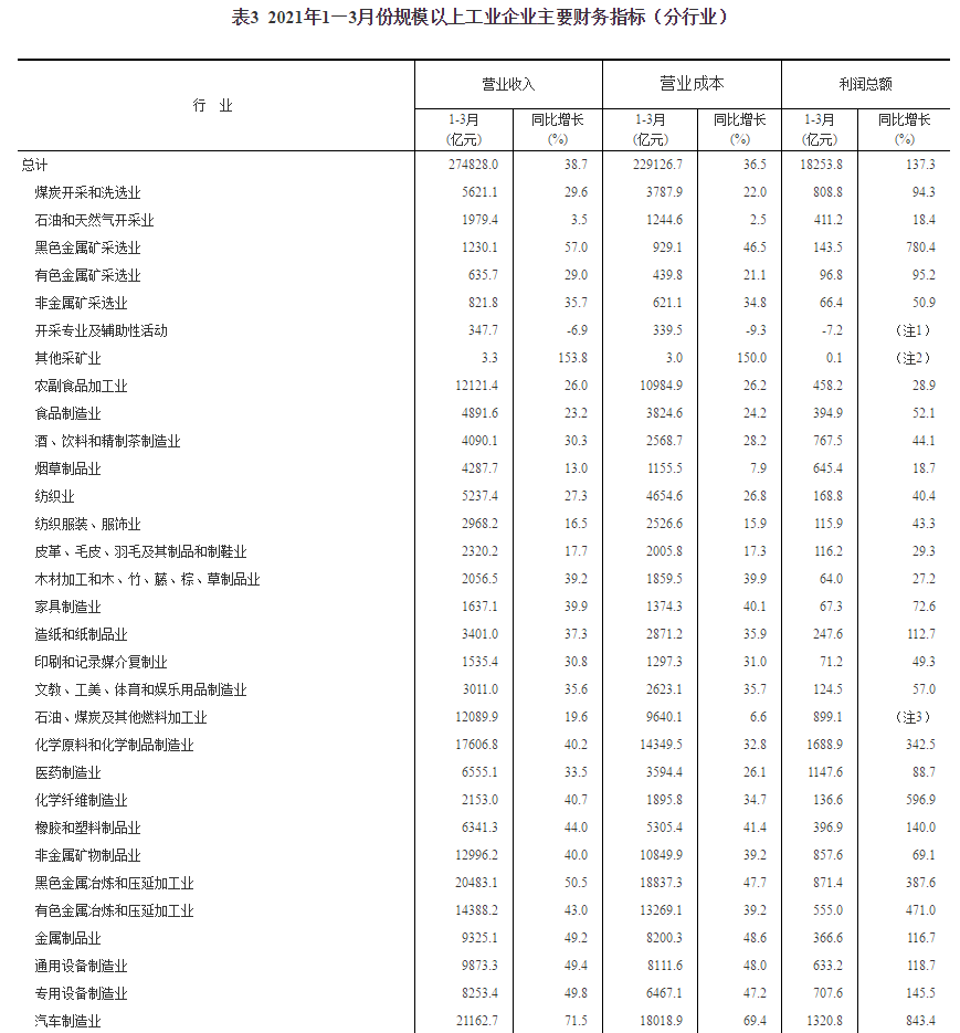 1—3月份,在41个工业大类行业中,39个行业利润总额同比增加,1个行业扭亏为盈,1个行业实现减亏。主要行业利润情况如下:汽车制造业利润总额同比增长8.43倍,有色金属冶炼和压延加工业增长4.71倍,黑色金属冶炼和压延加工业增长3.88倍,化学原料和化学制品制造业增长3.43倍,电气机械和器材制造业增长1.67倍,专用设备制造业增长1.46倍,计算机、通信和其他电子设备制造业增长1.41倍,通用设备制造业增长1.19倍,煤炭开采和洗选业增长94.3%,非金属矿物制品业增长69.1%,电力、热力生产和供应业增长50.7%,纺织业增长40.4%,农副食品加工业增长28.9%,石油和天然气开采业增长18.4%。