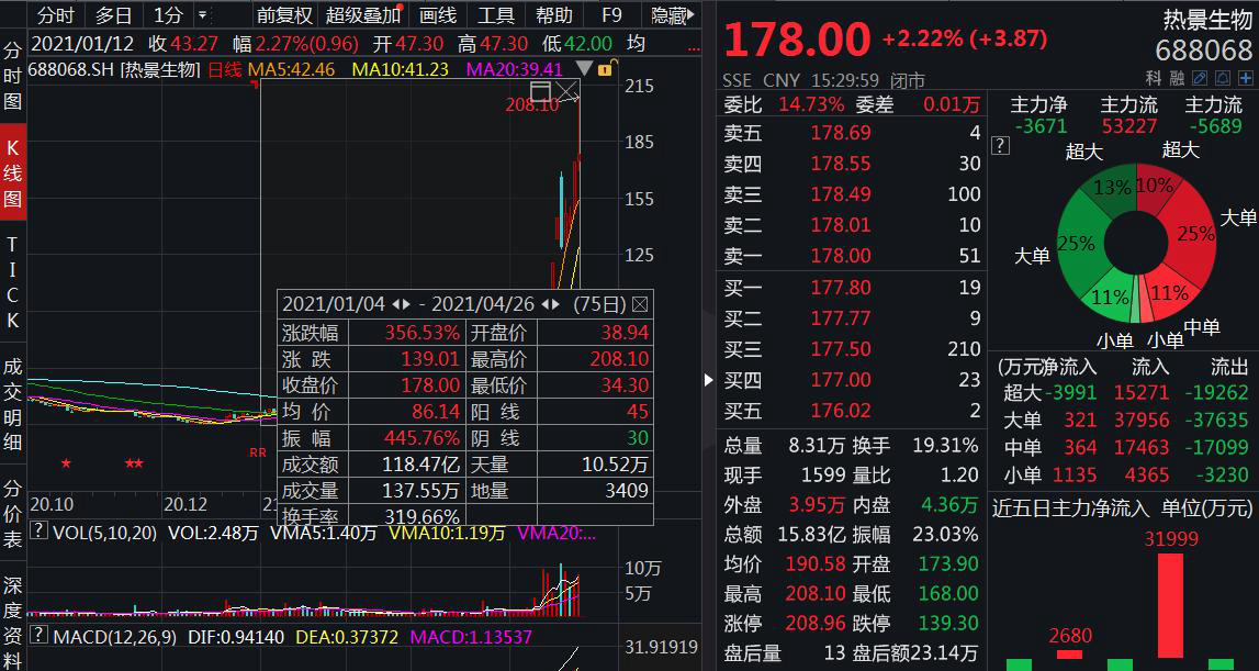 与业绩齐飞的还有热景生物近期股价。4月26日,热景生物股价一度冲上历史最高点208.1元/股,此后有所回落,报收于178元/股。4月以来,热景生物股价暴涨,从4月1日的43.76元/股冲至200元/股以上,今年累计涨幅超过350%。