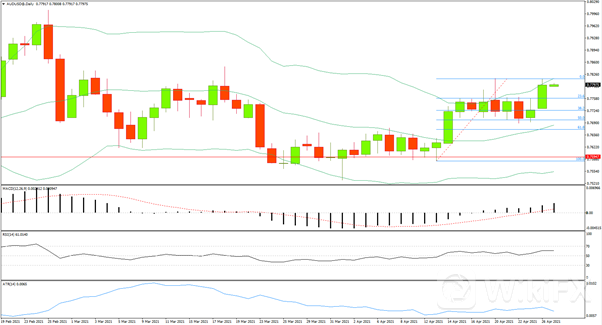 日线级别大幅收涨,上触前高后回落至布林带上轨之下,MACD上行动能增强,RSI偏向多方,4小时级别价格沿布林带上轨单边上行,MACD上行动能增强,RSI临近超买。今日多单在0.7760入场,止损在0.7730,止盈在0.78。