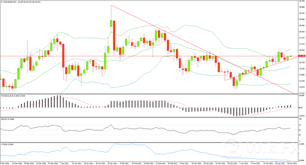 4月26日美元指数在八周低位附近企稳,在美联储政策决定公布前,美元空头交投较为谨慎,欧元从八周高位回落,分析师们将关注点放在经济的大方向上,任务德国经济稳步走在从新冠危机中复苏的道路上,英国的疫苗注射达到了一个重要的里程碑,超过50%的人口至少注射了一次疫苗。英国央行副行长布罗德本特说,他预计至少未来几个季度经济增长将会非常迅速。金价持稳,市场在美联储会议前避免大动作,原油方面,油价周一小幅收跌,OPEC表示正在关注印度新冠病情,可能削弱这个世界第三大石油进口国的燃料需求。OPEC+本周的会议也吸引市场关注。