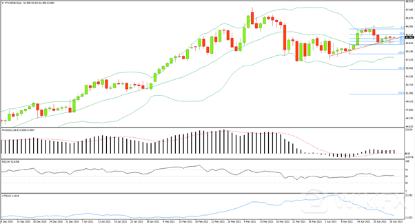 日线级别大幅下探后在斐波61.8%回撤后几乎收回全部跌幅,收在上行趋势线和斐波38.2%回撤位置之上,收锤头,日线MACD上行动能保持但有顶背离趋势。RSI多空博弈。4小时级别价格两连跌后两连涨但仍受制于62.2一线阻力,今日 偏逢高做空为主,激进62.2 区域空,止盈参考61,60.8,损62.8.