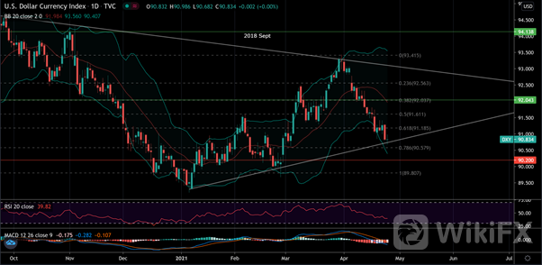The decline in U.S. long rates is one of the main reasons for the dollar's decline. With investors becoming less concerned about slippage in inflation, the U.S. 10-year yield fell to a five-week low of 1.56% on Friday despite strong economic data such as the better-than-expected preliminary April PMI figures, which were released on Friday at a record high.