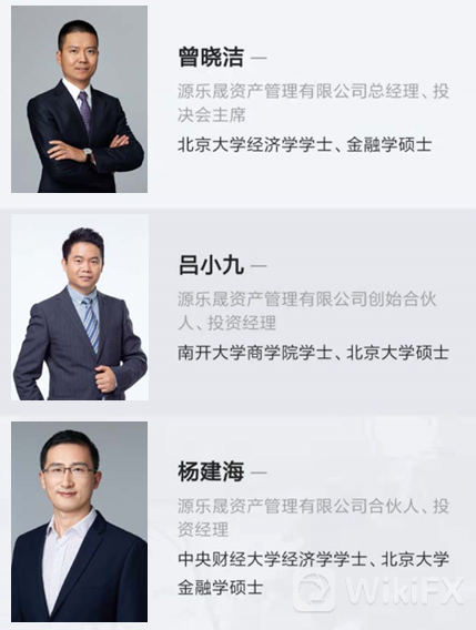 三位合伙人均是北大同一届的同学,曾晓洁和杨建海是经院的同班同学,吕小九在光华。2003年他们硕士毕业后,曾晓洁和吕小九同时进入了中国人寿。曾晓洁在2008年创立了源乐晟,而吕小九2005年后先后转去中信证券研究所和交银国际,并于2009年加入了源乐晟。
