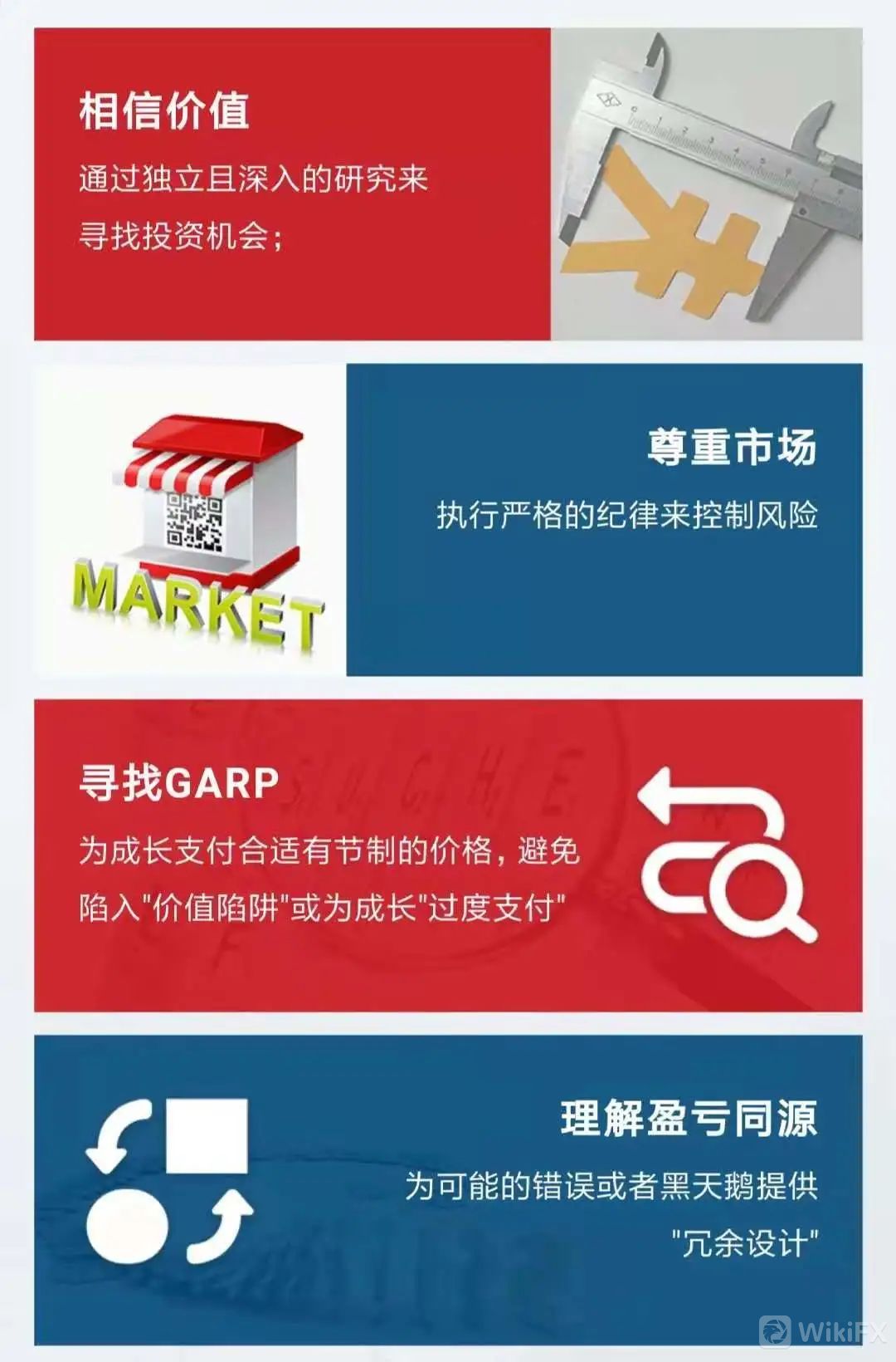1、相信价值:通过独立且深入的研究来寻找投资机会;2、 尊重市场:执行严格的纪律来控制风险;3、 价格和成长的匹配:为成长支付合适有节制的价格(GARP),避免陷入“价值陷阱” 或为成长“过度支付”;4、 理解盈亏同源:为可能的错误或者黑天鹅提供“冗余设计”。