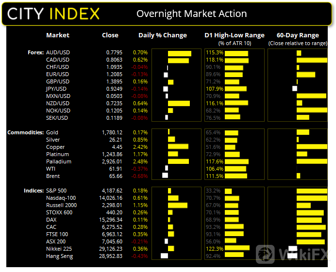 美国承诺与其它国家共享最高6000万剂阿斯利康疫苗,尽管阿斯利康的疫苗都未获得在美国使用的授权。在美国股市迎来数量众多的财报之前,纳斯达克与标普500指数逼近历史高点。今天到周四之间,标普500指数约40%的成份股将揭晓业绩报告,所以该指数波动性可期,但是向上波动还是向下波动则不可知。11个板块中有7个板块上涨,其中能源股独领风骚,而公用事业与必需消费品板块垫底。