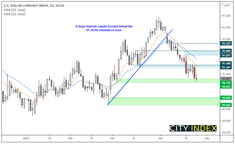 美元指数上周五形成看跌吞噬K线,恰好止步于91.30阻力位。受制于91.40我们继续看跌,目标指向破败趋势线底部89.90。但昨天在90.63支撑位上方出现犹豫K线形态(Rikshaw Man十字星),可能暗示即将进入一段盘整期。