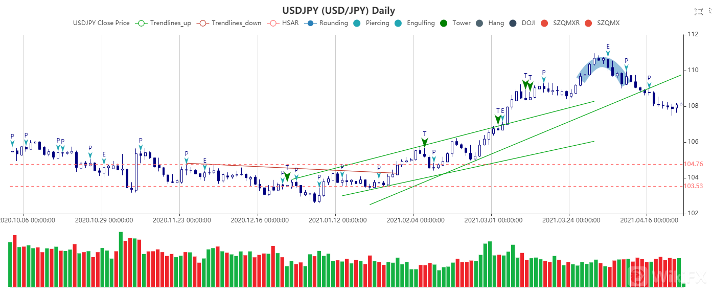 鉴于日本发布3月份公司服务价格指数,好于预期,以及市场预期日本央行将维持短端利率-0.1%和10年期债券收益率0%目标不变。此外,美债收益率和美股上涨提振美元/日元。日线图显示,美元/日元结束6连跌势,昨日转为上涨,价格从年初至今升势的38.2%斐波那契回撤水平107.70一线后,今日凌晨价格上涨至108.30附近,届时将关注曾在3月阻碍汇价上行的109.34一线。反之,若汇价跌破年初以来的上升支撑,则有望继续跌至107.00一线。