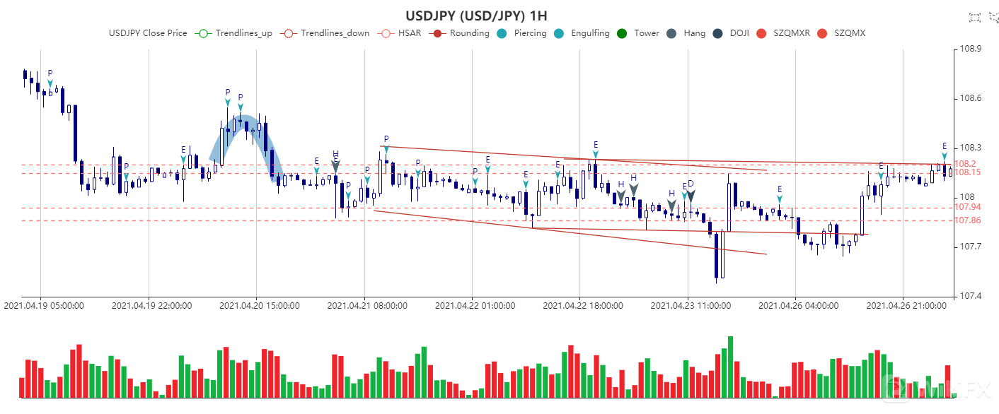 小时图显示,美元/日元短线维持中性,整体仍偏下行。下方支撑看向107.80,接着位于107.45,反之,上方阻力看向108.80,接着位于109.20。
