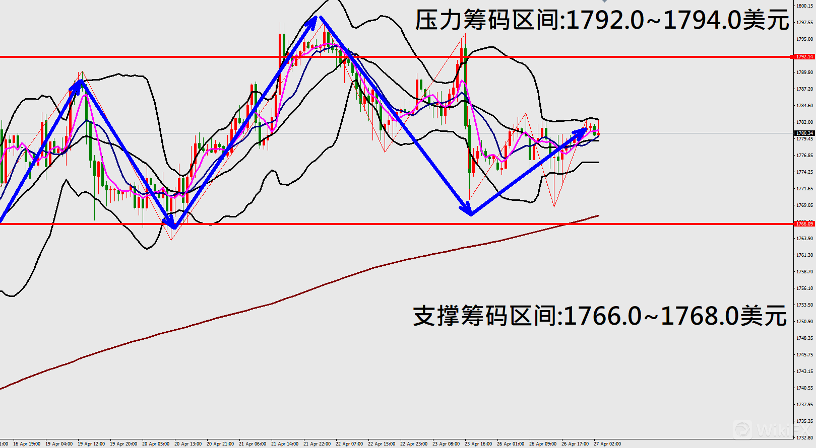 今日黄金(4月27日)早盘在1781.1美元/盎司附近,从技术分析面切入1小时级别观察走势架构符合昨日(26日)预测K棒冲高遇压后出现拉回修正行情,目前K棒反弹落在布林通道中轨附近震荡,同时开口转折朝上,因此有机会拉回修正后再度反弹上涨。