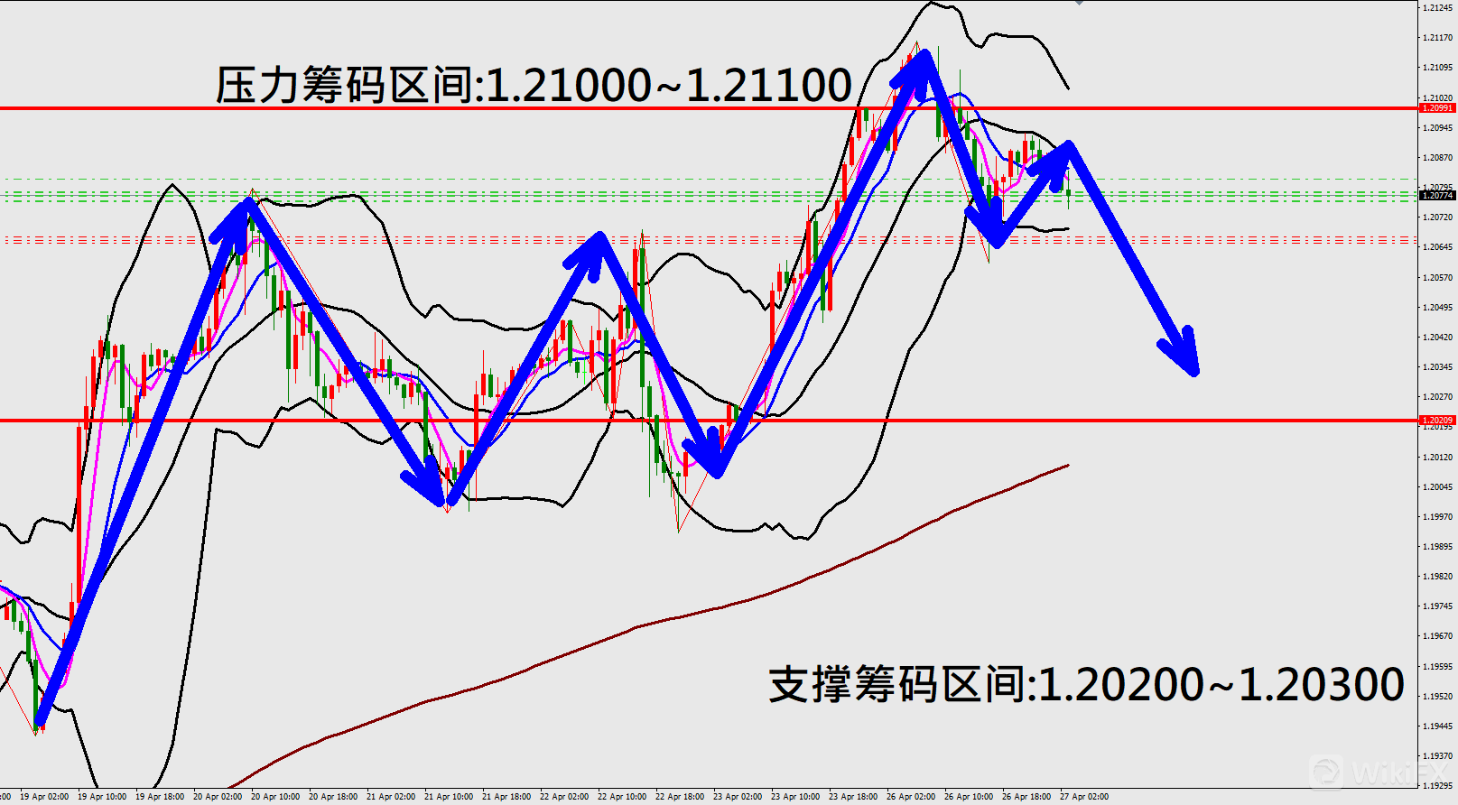 今日欧元/美元(4月27日)早盘在1.20847附近,从技术分析面切入,1小时级别观察走势架构昨日(26日)K棒高点狭幅震荡后,出现大幅拉回修正行情,目前K棒反弹落在布林通道中轨与下轨之间,同时开口转折朝下,因此有机会持续向下修正。