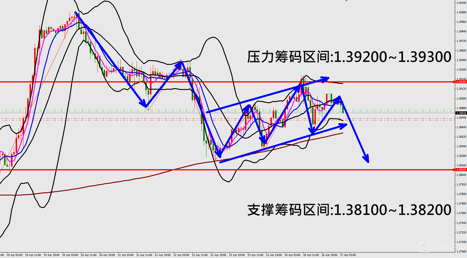 今日英镑/美元(4月27日)早盘在1.38938附近,从技术分析面切入,1小时线级别观察走势架构昨日(26日)K棒出现冲高遇压后,出现拉回修正行情,目前K棒反弹落在布林通道中轨下方震荡,同时开口转折朝下,因此有机会再度出现向下修正行情。